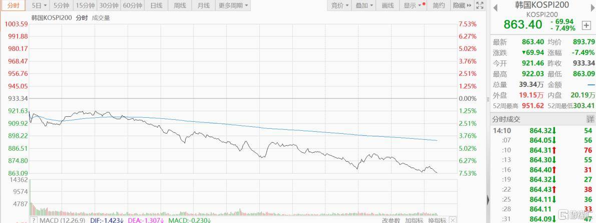 韩国股市遭受“史诗级重挫”——KOSPI 200指数期货暴跌超7%,触发熔(rong)断(duan)机制,程序化生意业务被迫暂停5分钟,韩国综(zong)合指数同(tong)步重挫近7%,创下近期单日(ri)最大跌幅。